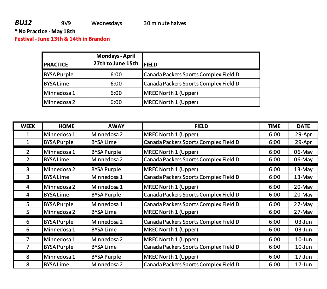 Boys U12 Schedule